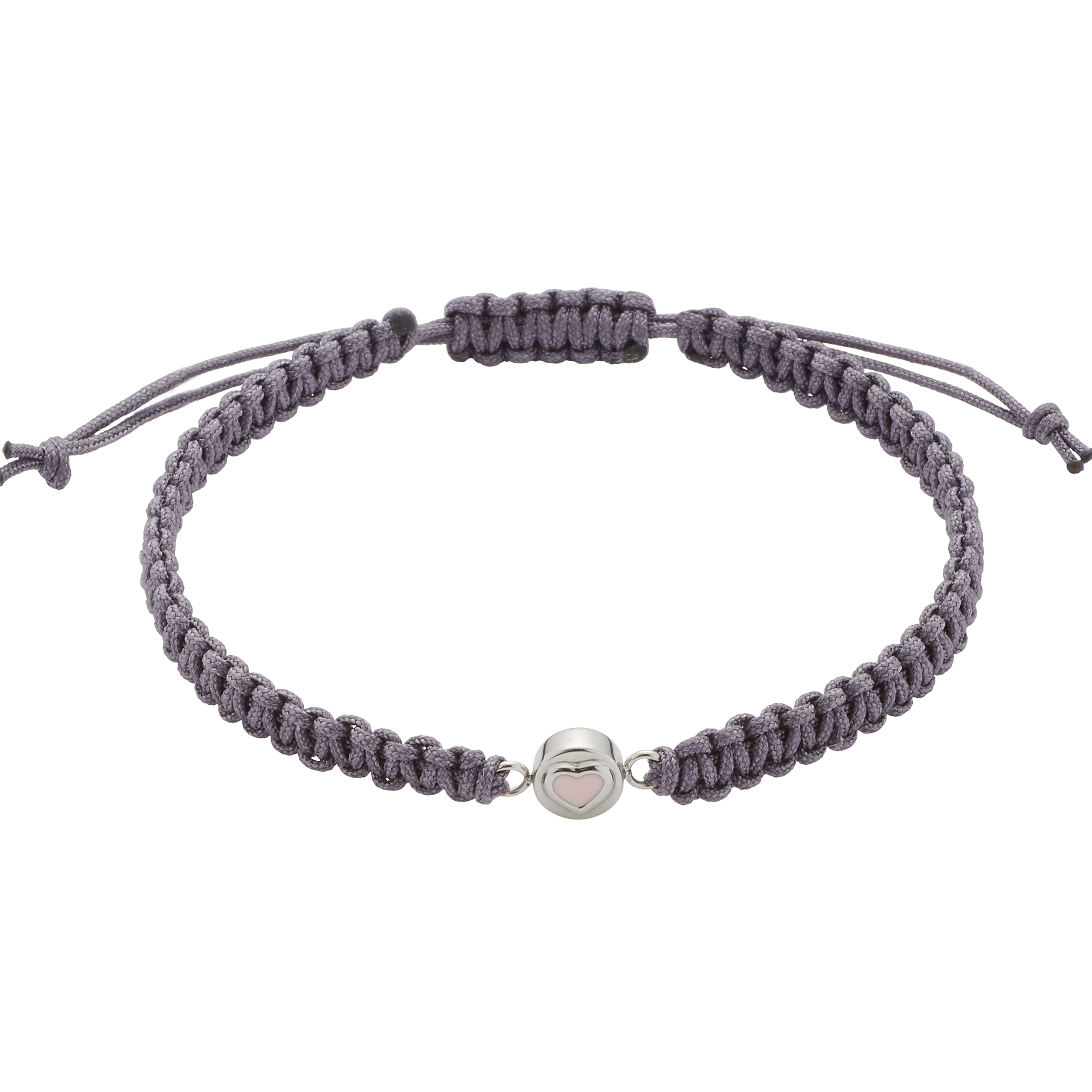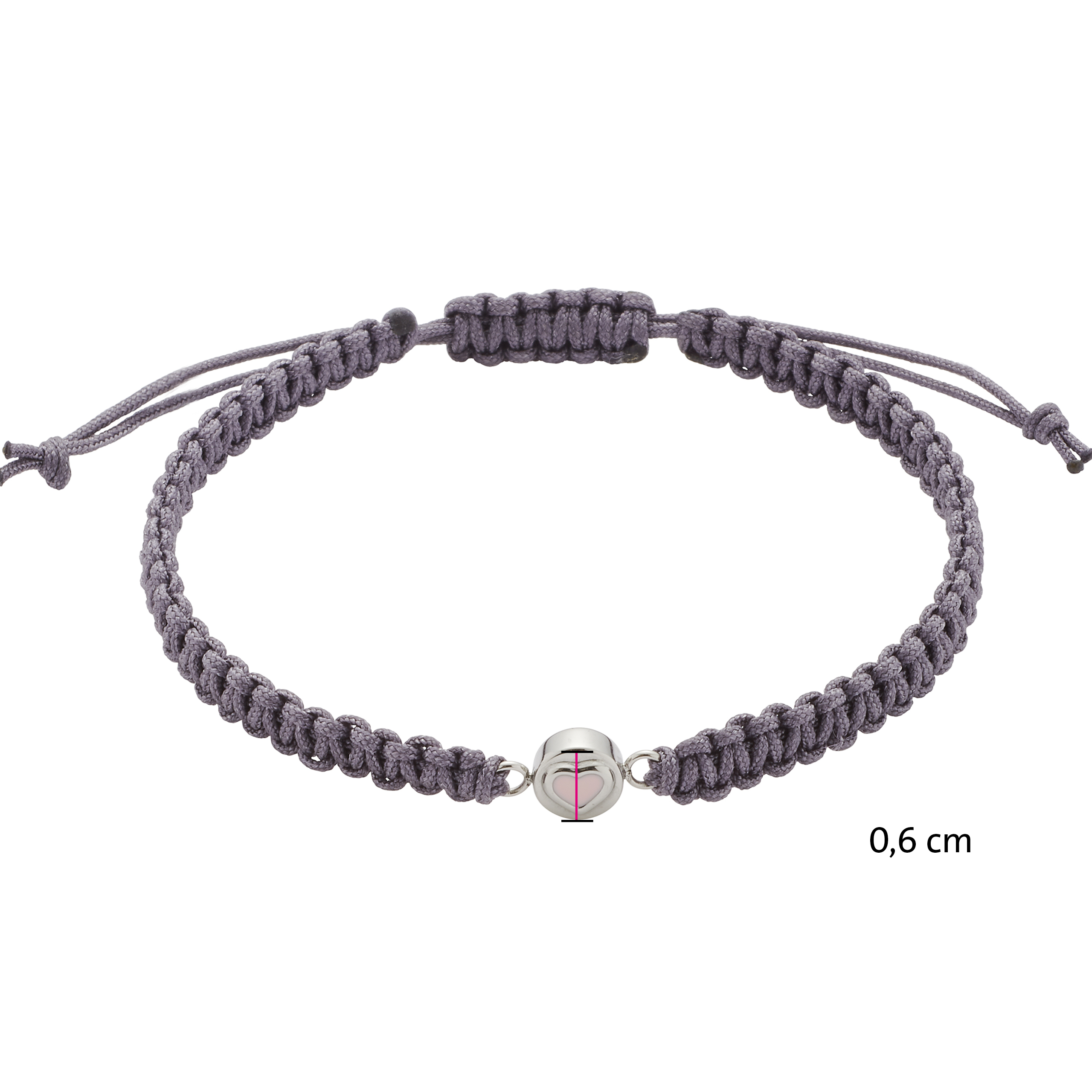 Tento náramok je vyrobený zo spletaného textilu, ktorý je v strede zdobený pekným motívom srdca. Srdiečko je vyplnené ružovým studeným smaltom, aby vytvorilo krásny kontrast k tmavosivému náramku.