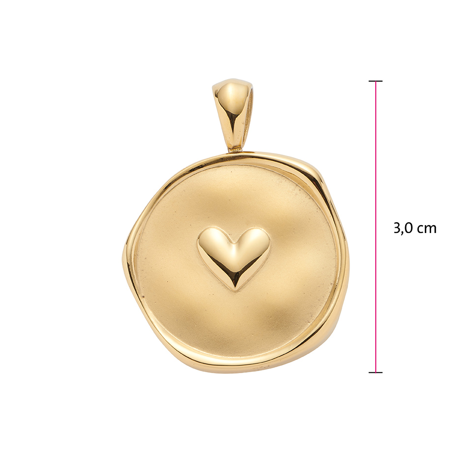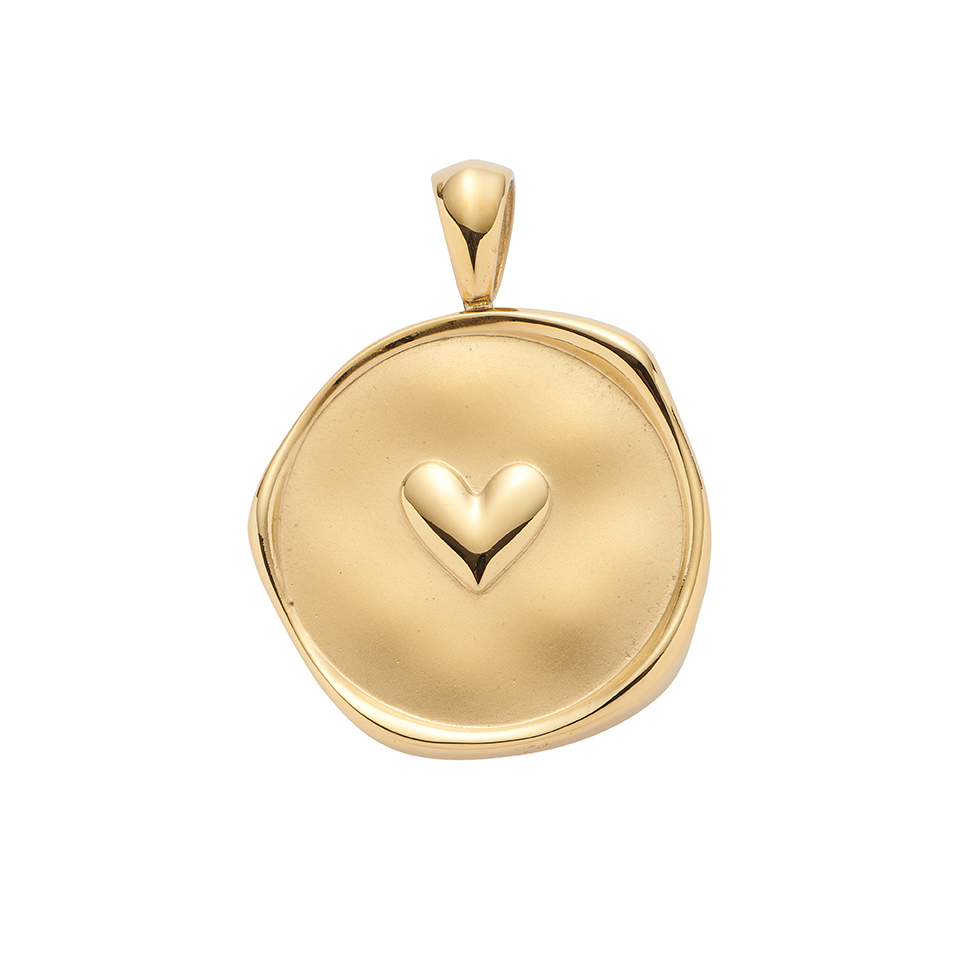 Kombinácia matného povrchu a lešteného motívu na tomto prívesku obzvlášť dobre predstavuje srdce v jeho strede. Mäkký a organicky tvarovaný rám bol tiež leštený a vytvára pre tento kus ušľachtilý vzhľad pečate alebo starej mince.