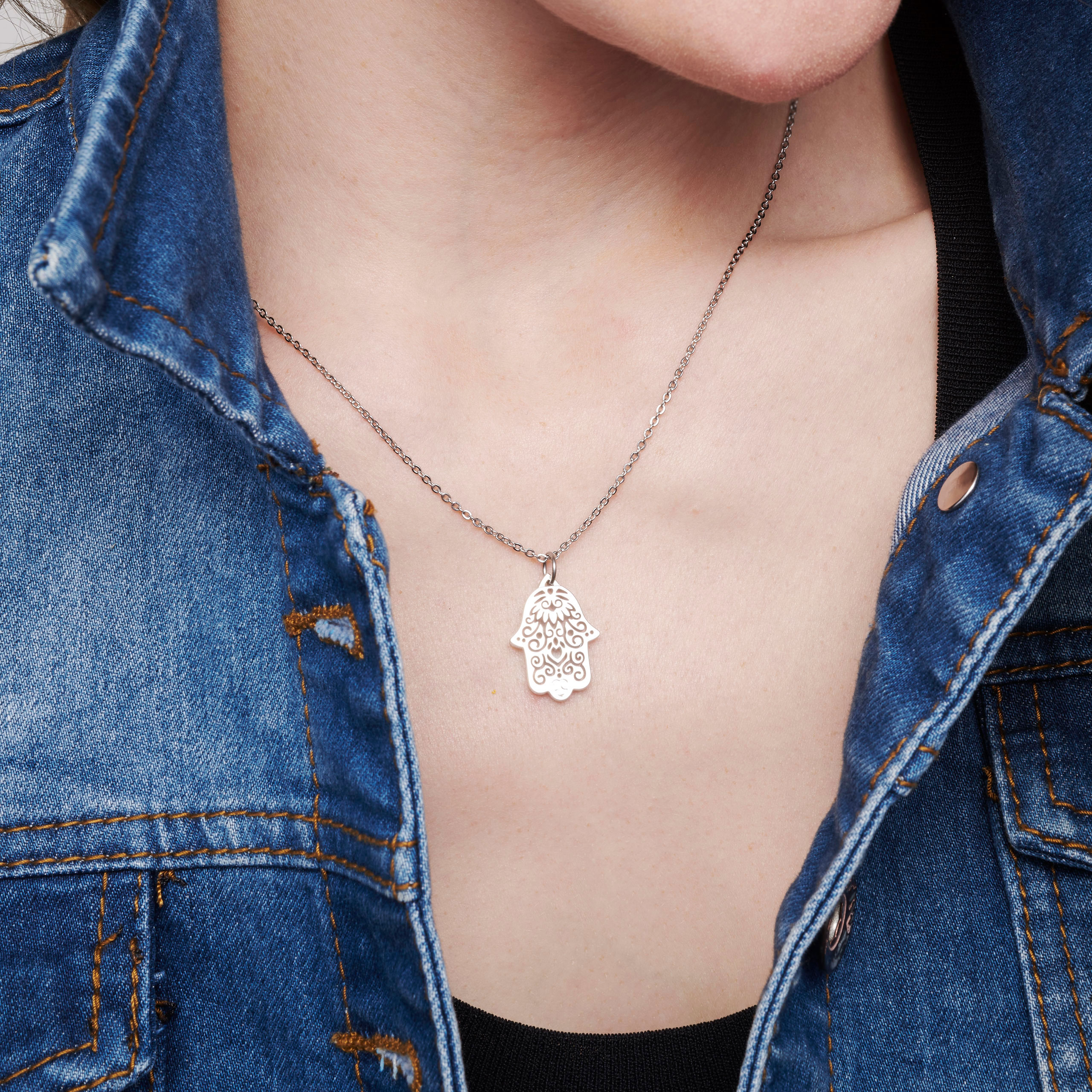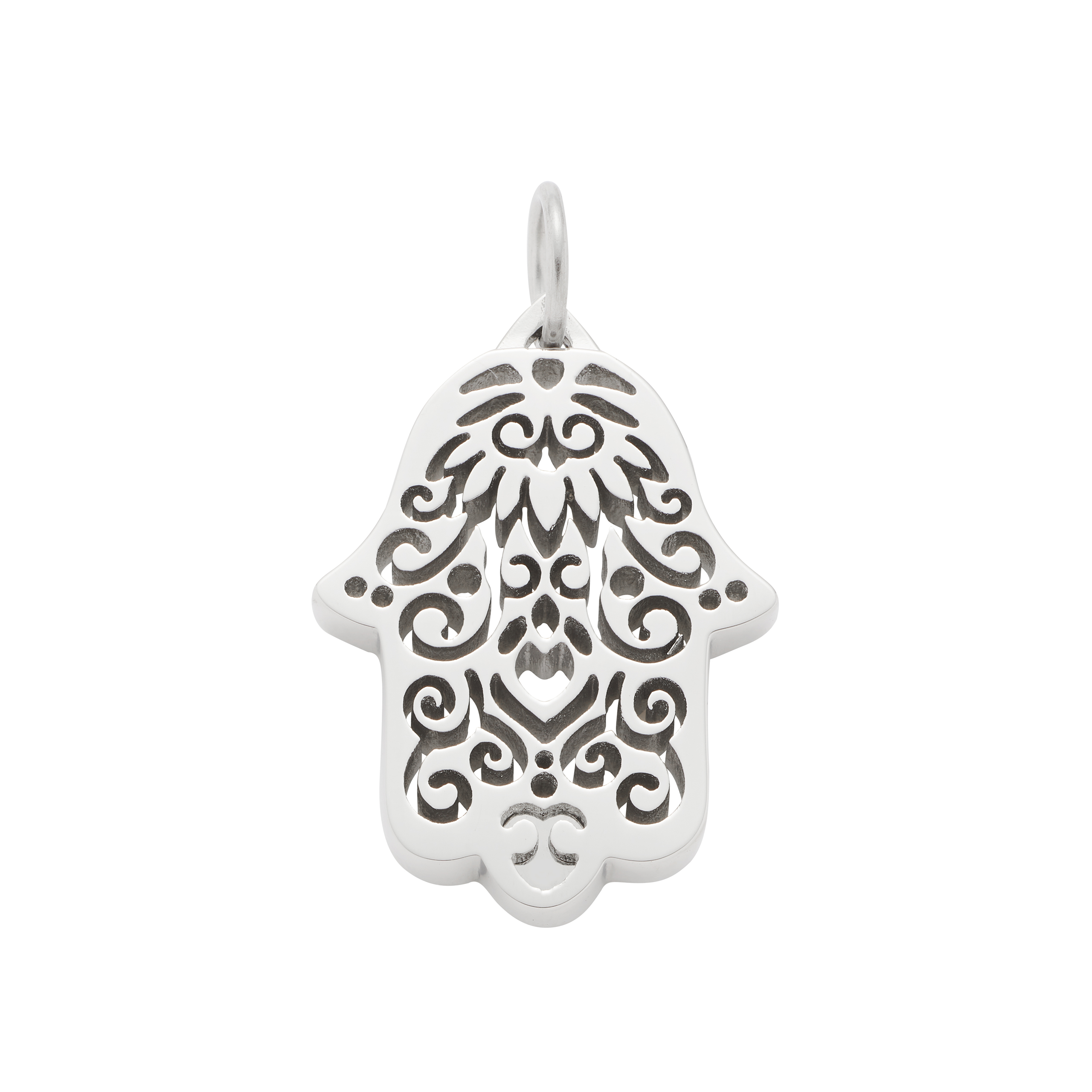 Tento oceľový prívesok zobrazuje Fatimskú ruku – ochranný symbol. Diel je vyrobený z leštenej chirurgickej ocele a je možné ho rôznymi spôsobmi kombinovať.
