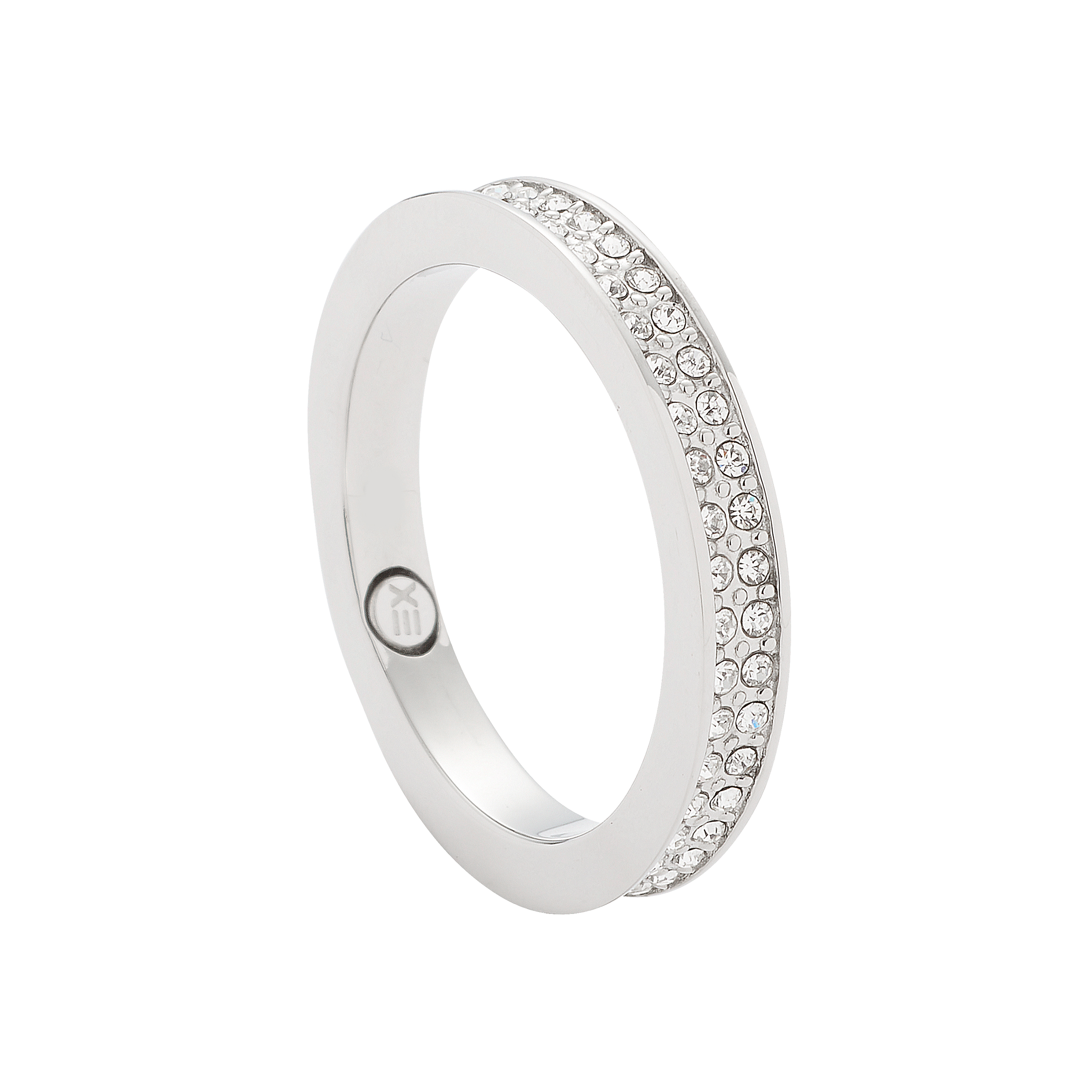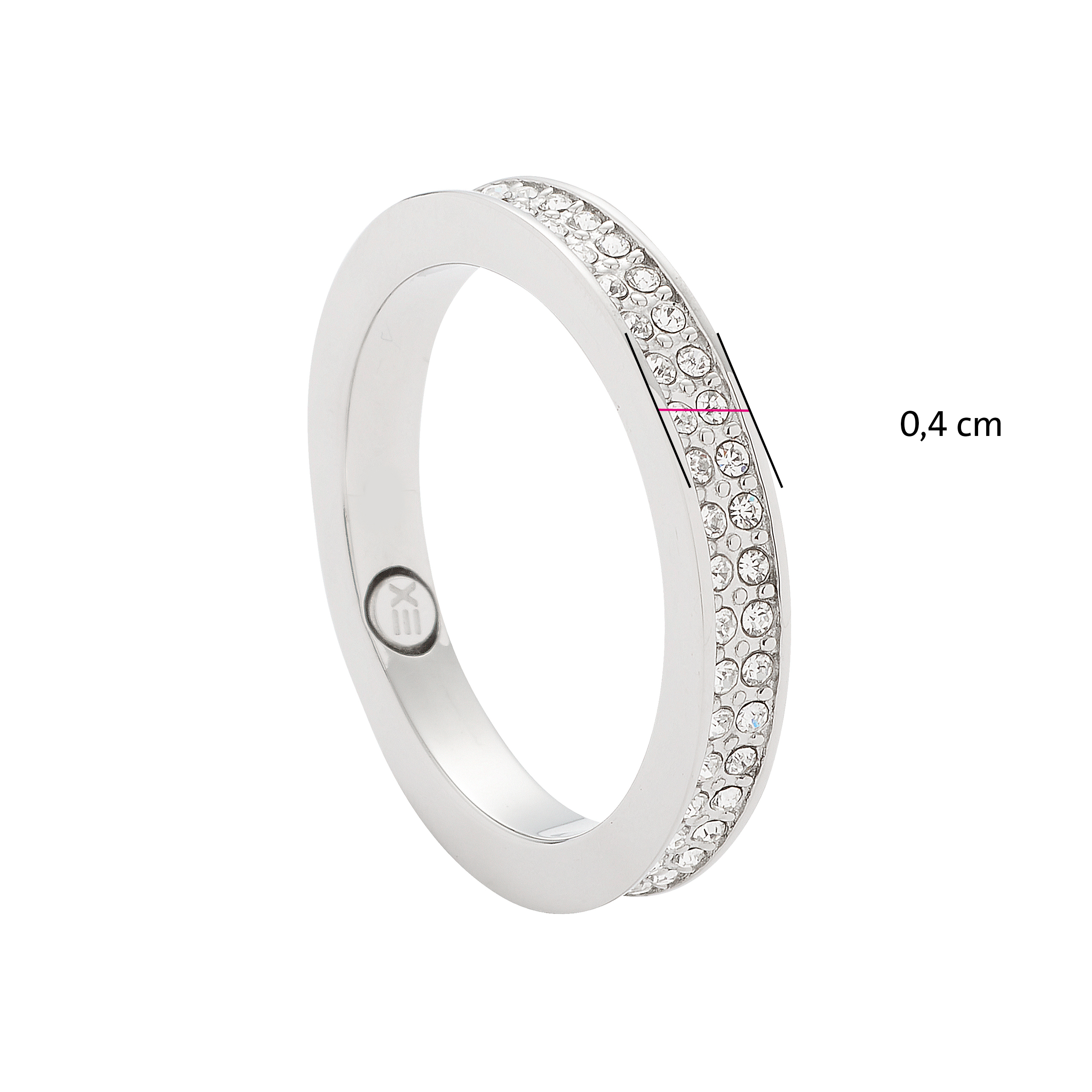 Tento štíhly prsteň presvedčí veľmi jasným dizajnom, ktorý je moderný a zároveň nadčasový. Prsteň je vyrobený z leštenej chirurgickej ocele a osadená dvoma radmi malých trblietavých kryštálov. Tento šperk je veľmi prispôsobivý, čo znamená, že ho možno vždy kombinovať s rôznymi outfitmi a inými šperkami.