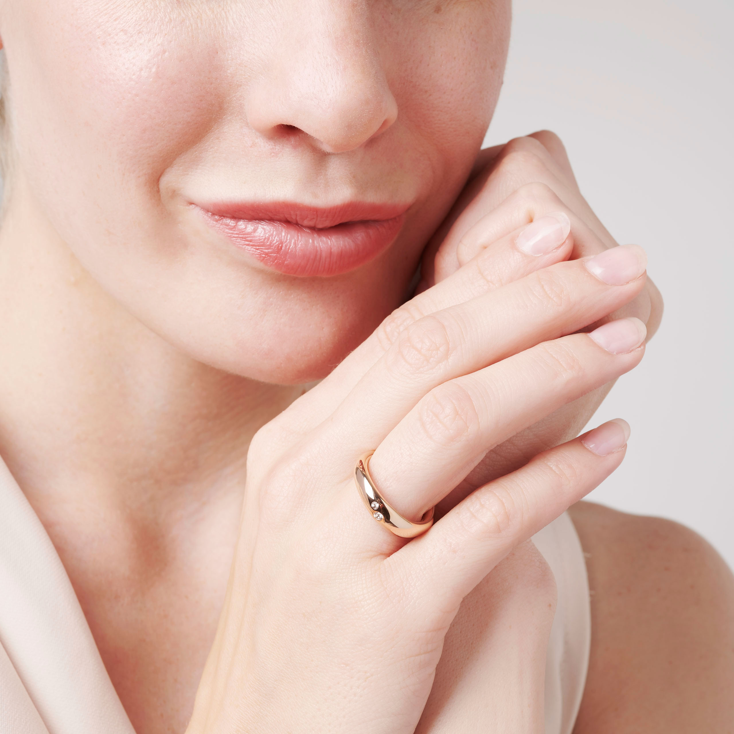 Niekoľko týchto nadčasovo krásnych prsteňov možno nosiť súčasne, pretože vďaka mierne zakrivenému dizajnu do seba dokonale zapadajú. Tento ružový šperk je osadený dvoma malými kryštálmi, ktoré vytvárajú krásny kontrast k leštenej chirurgickej povrchovej úprave a vďaka čomu sa prsteň nádherne leskne.