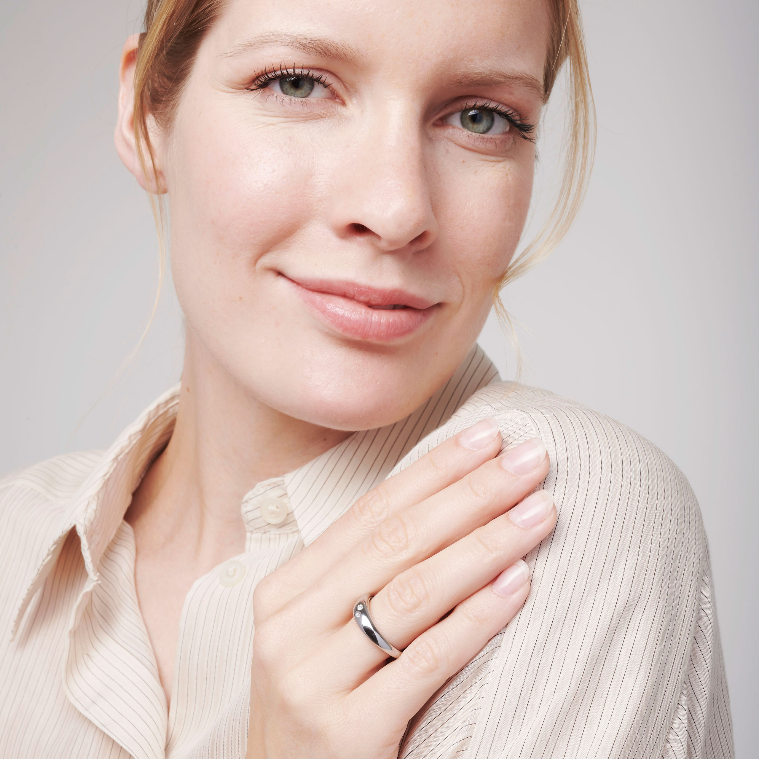 Tento prsteň nadchne svojim klasickým a nadčasovým dizajnom. Vyznačuje sa jednoduchým a mierne zakriveným dizajnom. Niekoľko týchto prsteňov je možné kombinovať podľa želania na jednom prste, pretože tvary do seba dokonale zapadajú. Dva malé kryštály boli osadené na leštenom povrchu z chirurgickej ocele, aby pôsobili ako vizuálne zvýraznenie.