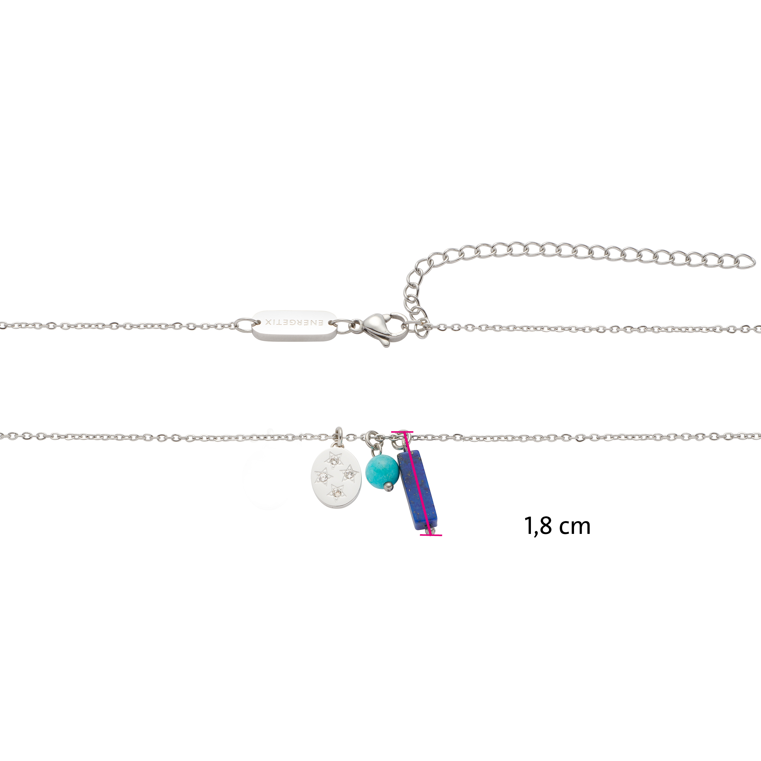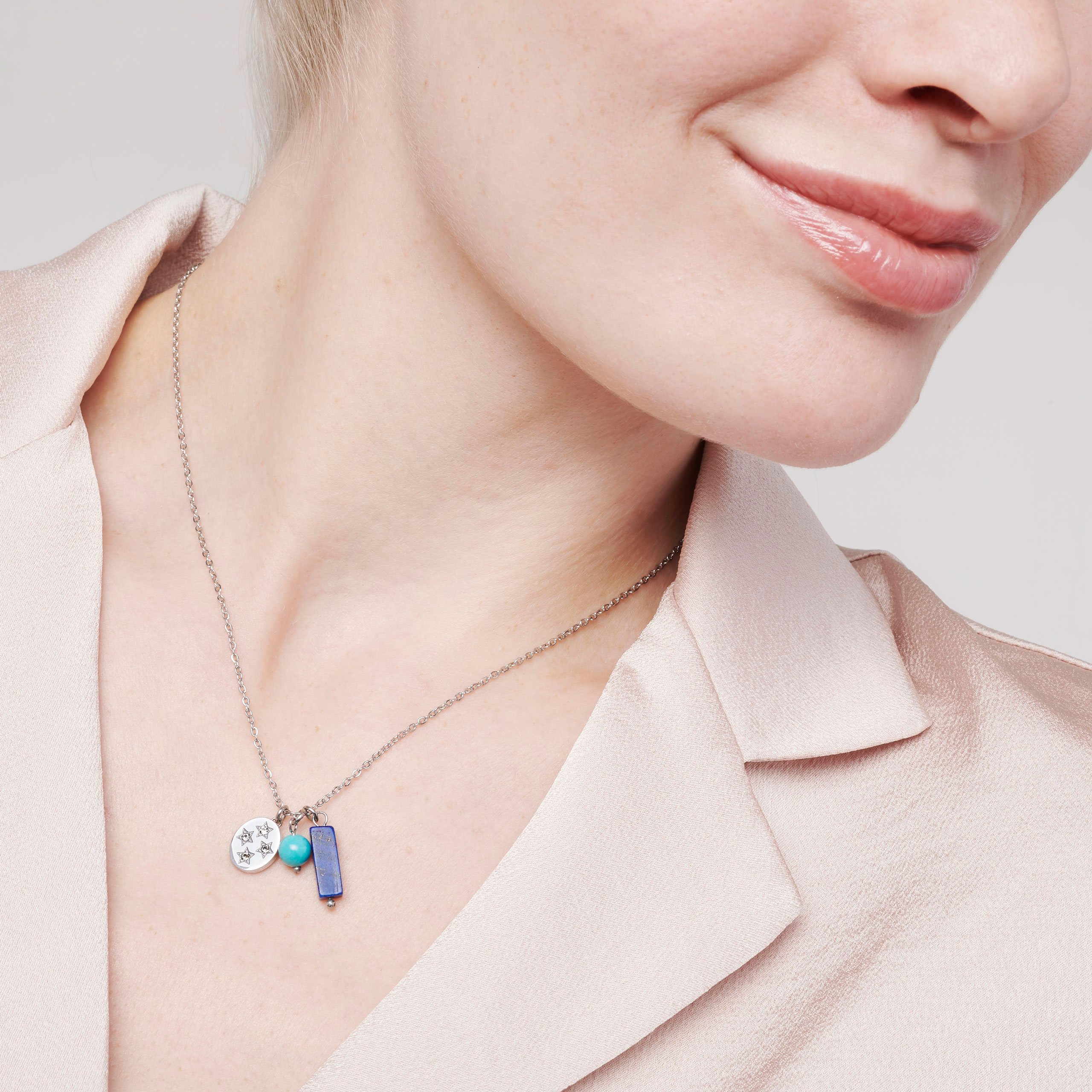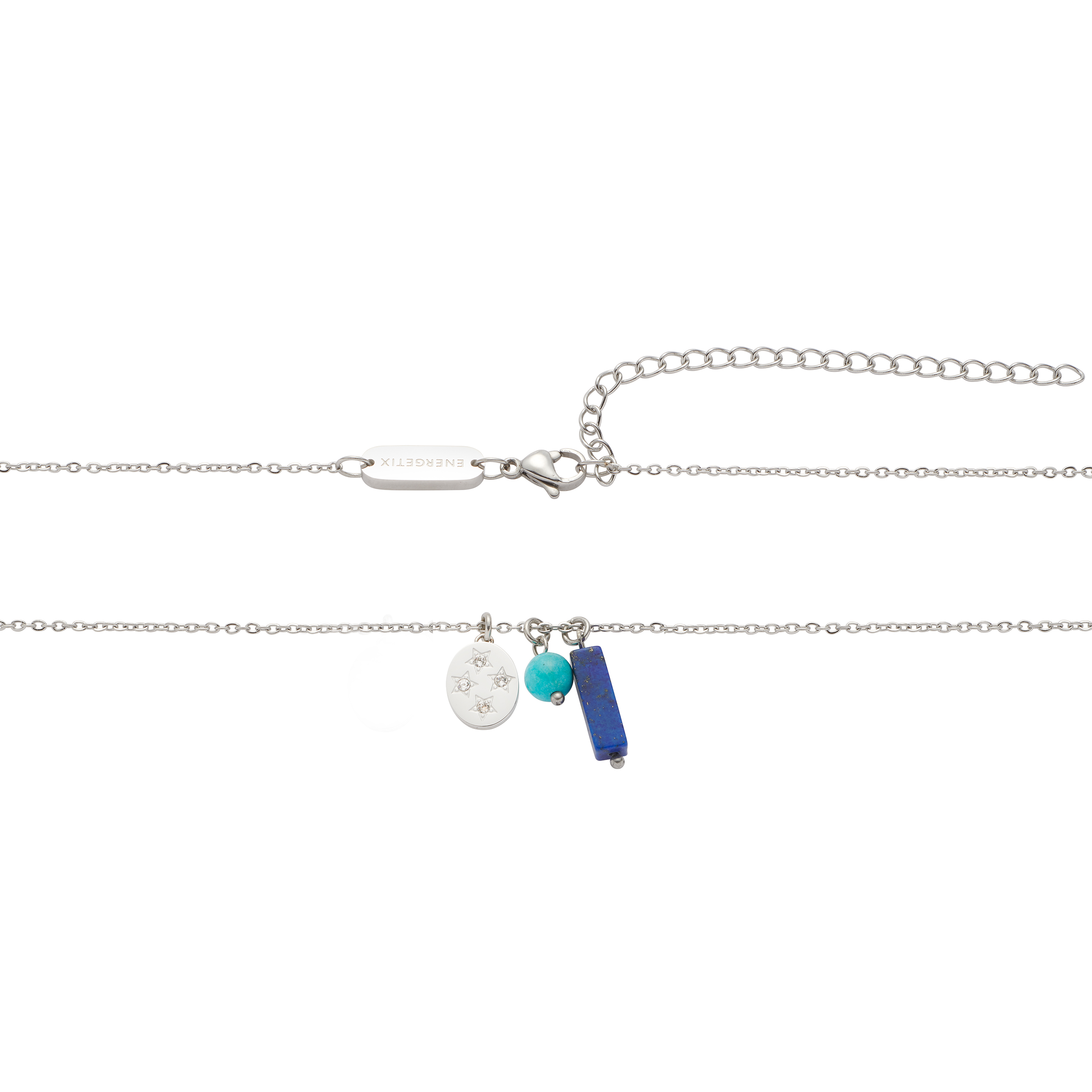 Tento jemný náhrdelník obsahuje celkom tri malé prívesky: dva s drahokamami a jeden s oválnym dizajnom. Prívesok s oválnym dizajnom je dodávaný so štyrmi kryštálmi, ktoré sú osadené na malých vtlačených hviezdach. Vo všeobecnosti je to veľmi úspešná kombinácia – taká, ktorá je vysoko módna a zároveň okorení každý moderný outfit.