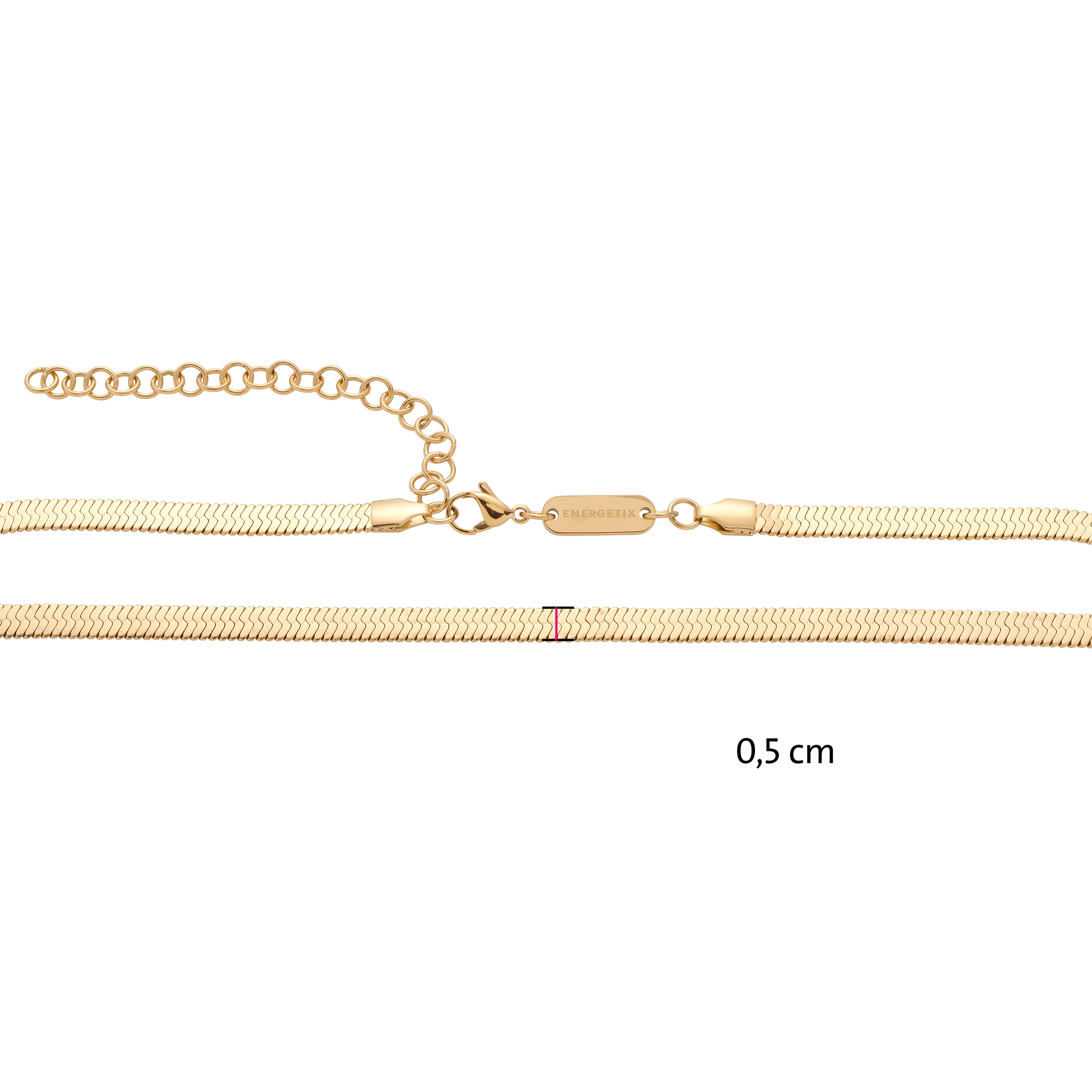 Tento náhrdelník presvedčí svojim špičkovým dizajnom hadej retiazky a moderným grafickým vzorom. Je veľmi flexibilná, príjemne mäkká, a preto sa dobre prispôsobí kontúram krku. Náhrdelník je vyrobený z leštenej chirurgickej ocele a vďaka farbe v jemných zlatých odtieňoch pôsobí obzvlášť elegantne a štýlovo.