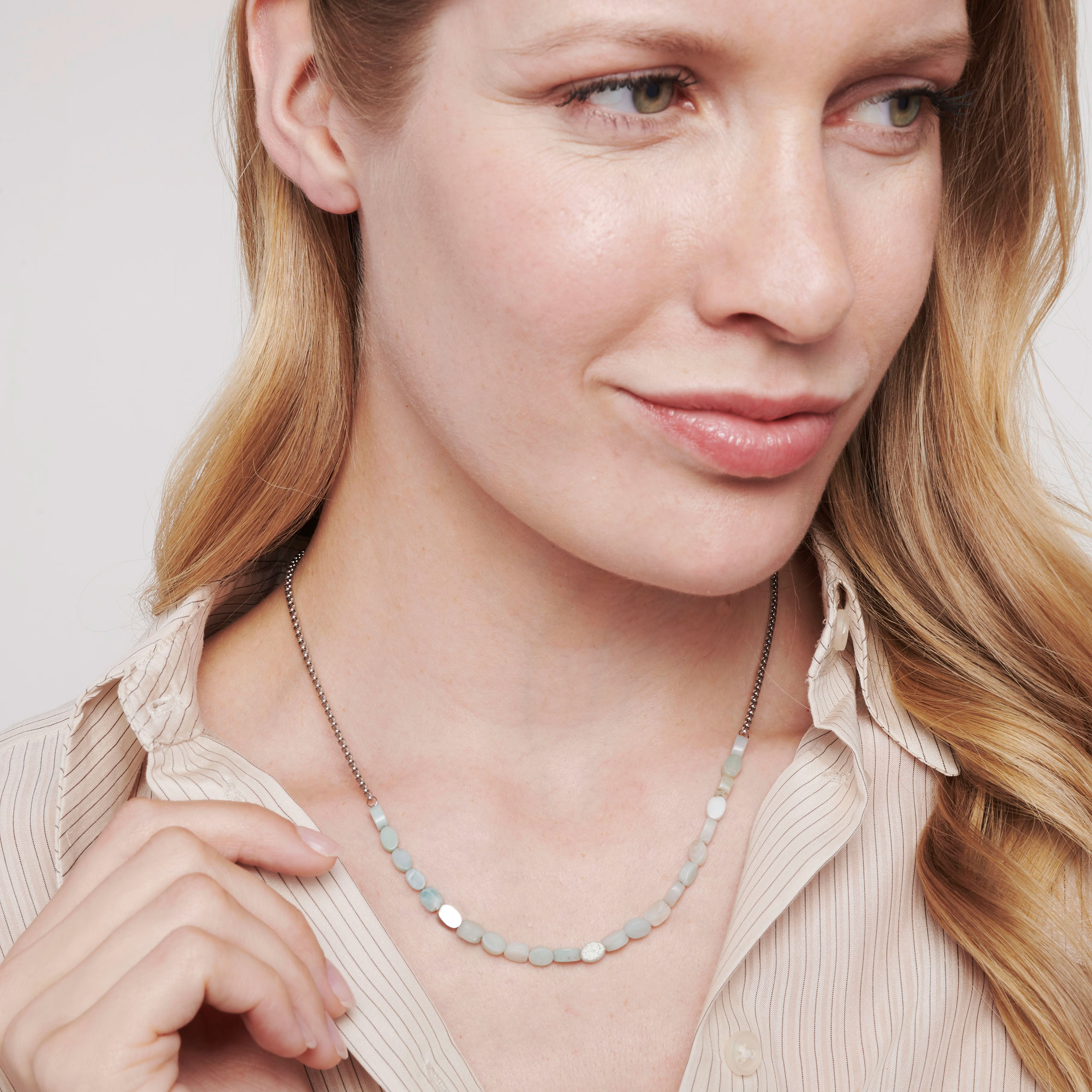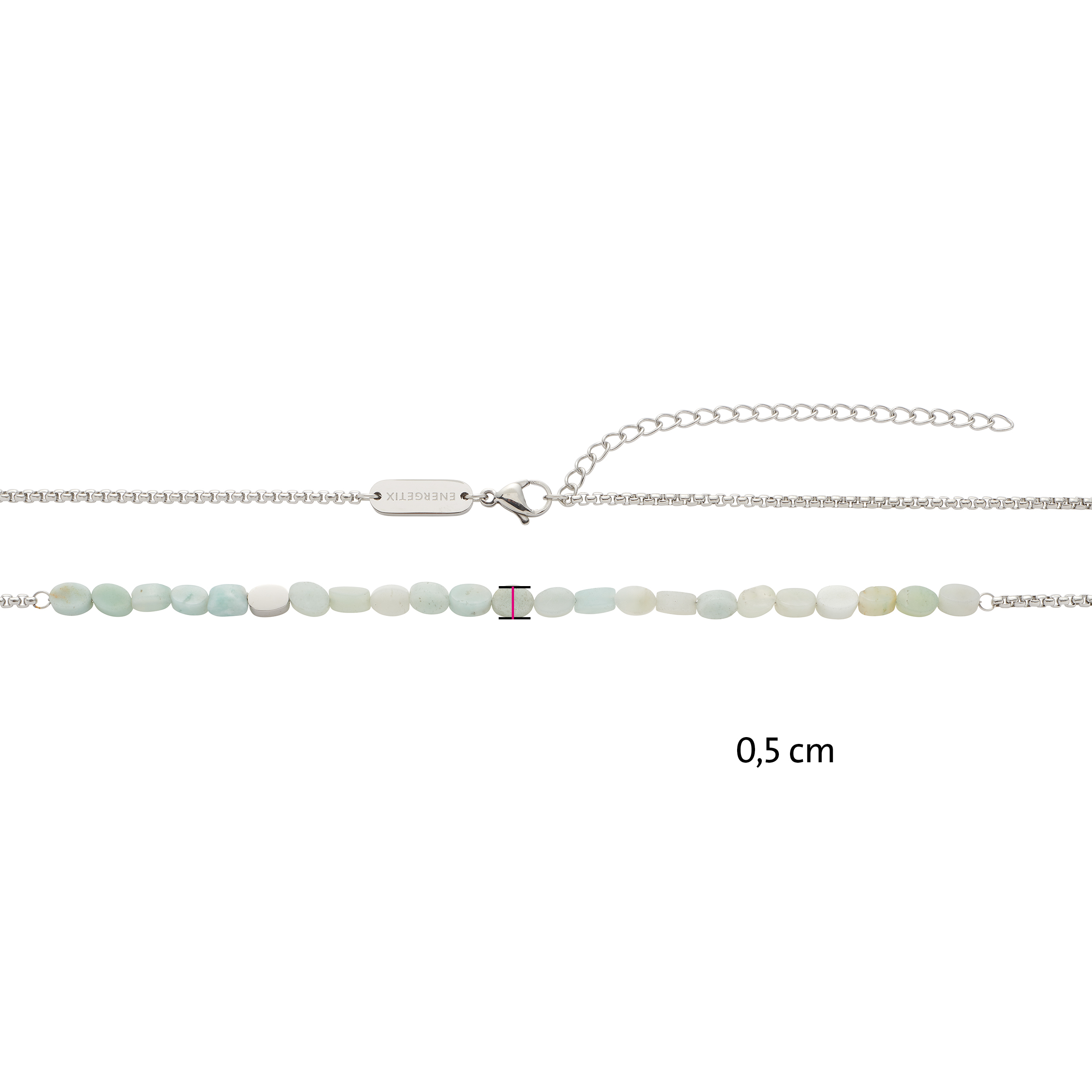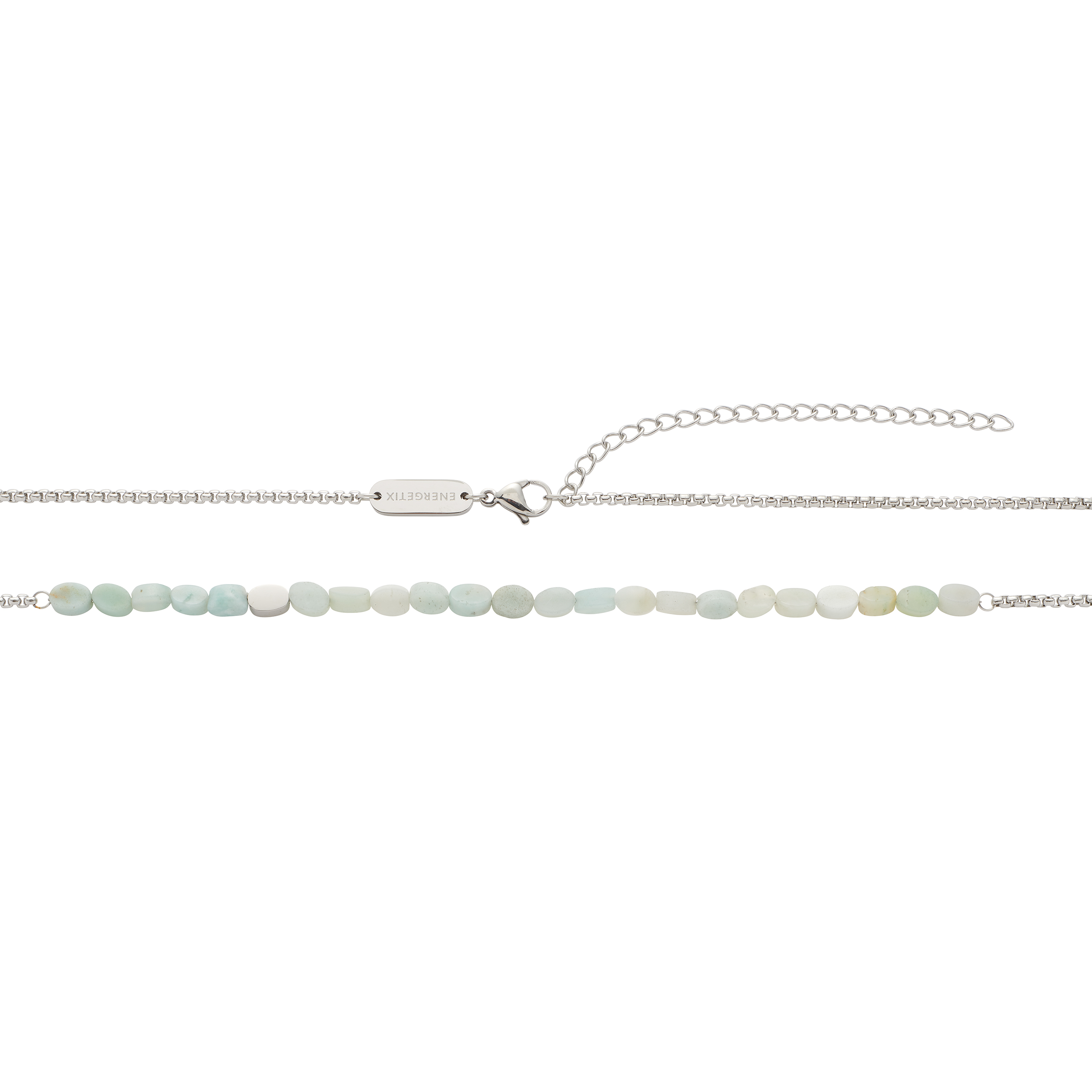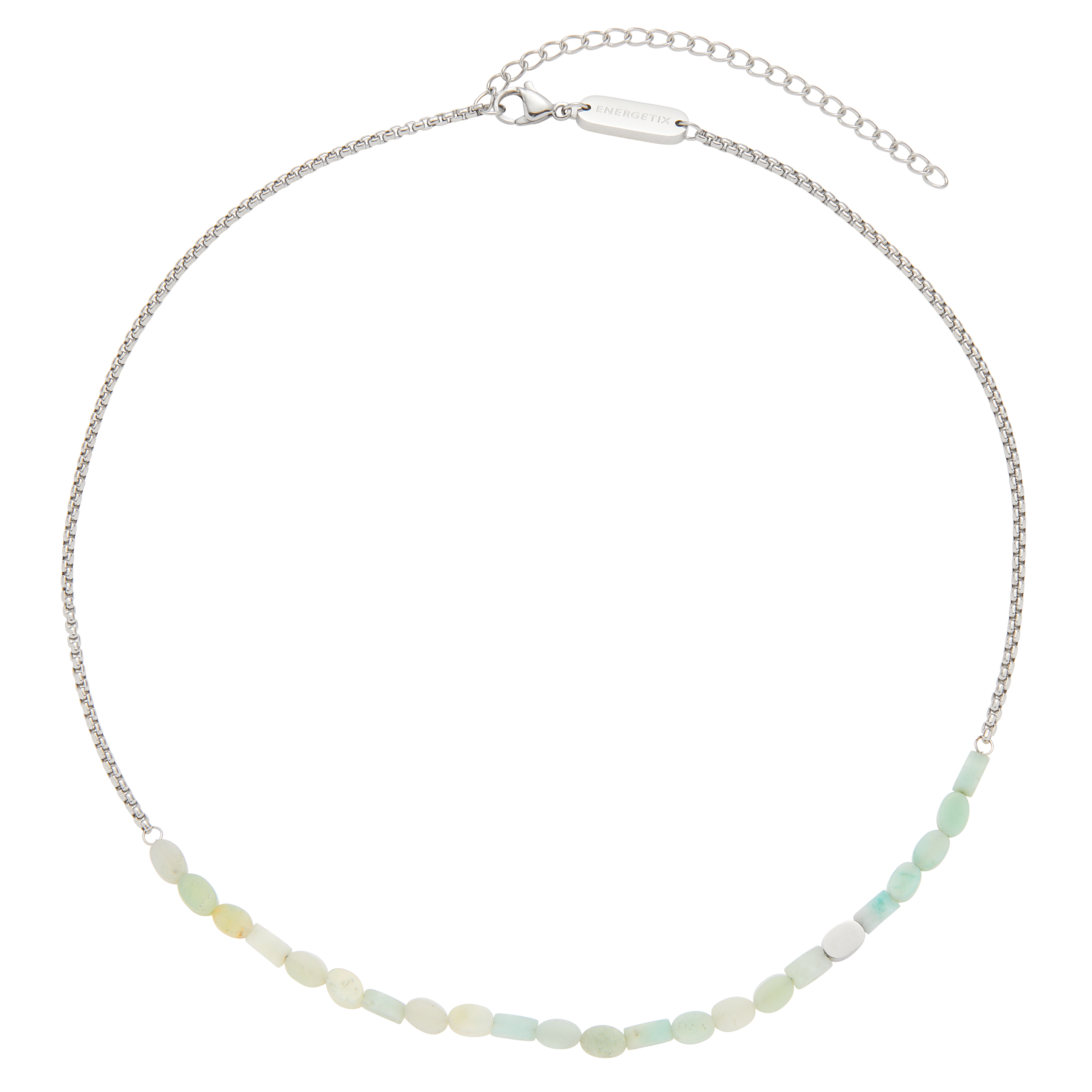 Jemná retiazka tohto náhrdelníka je kombinovaná s plochými, mierne oválnymi šošovkami z drahokamov (amazonitov) a lešteným prvkom drahokamu. Výsledný vzhľad pôsobí veľmi ľahko a moderne, a preto sa tento náhrdelník bude hodiť najmä k športovým každodenným outfitom.